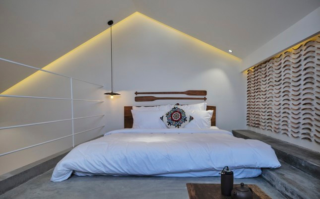 Khi vào bên trong, ngôn ngữ thiết kế vẫn giữ được sự thống nhất với "cuộc chơi" phối trộn. Trần bê tông lộ dầm cứng cáp thô nhám với tường ngói và đá xếp ngẫu hứng đi cùng sàn đá mài và nội thất gỗ có kiểu dáng truyền thống "rất Hội An.