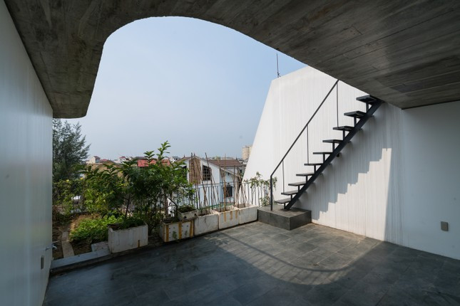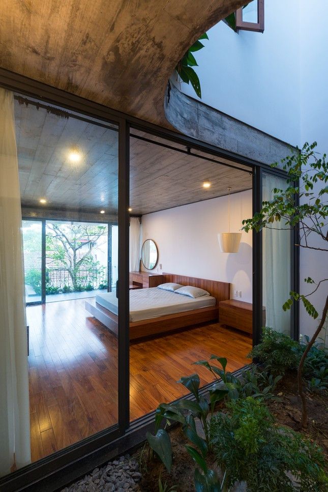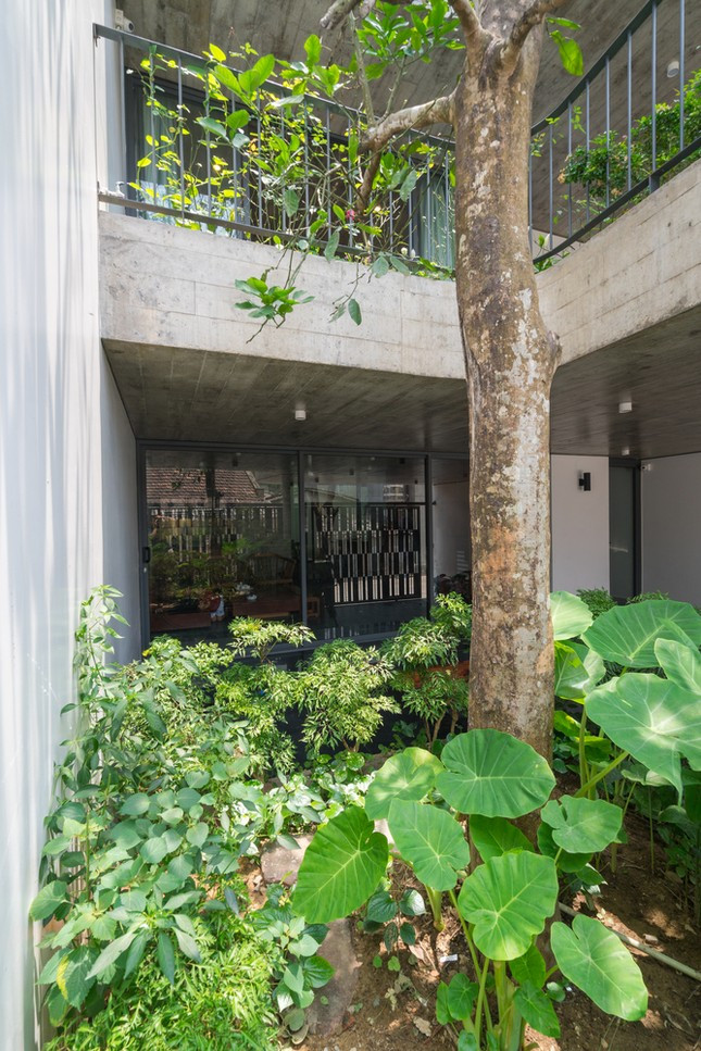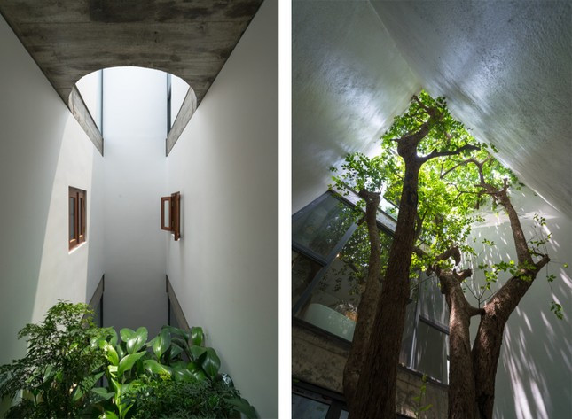 Mặt tiền ngôi nhà bố trí kiểu mở, nhiều cây xanh lùi dần vào trong để tăng cường sinh khí. Giếng trời và khu vườn nhỏ nằm ở trục giữa giúp đối lưu không khí theo chiều dọc. Khu vườn sau nhà giúp lọc tiếng ồn và cản gió mùa đông.