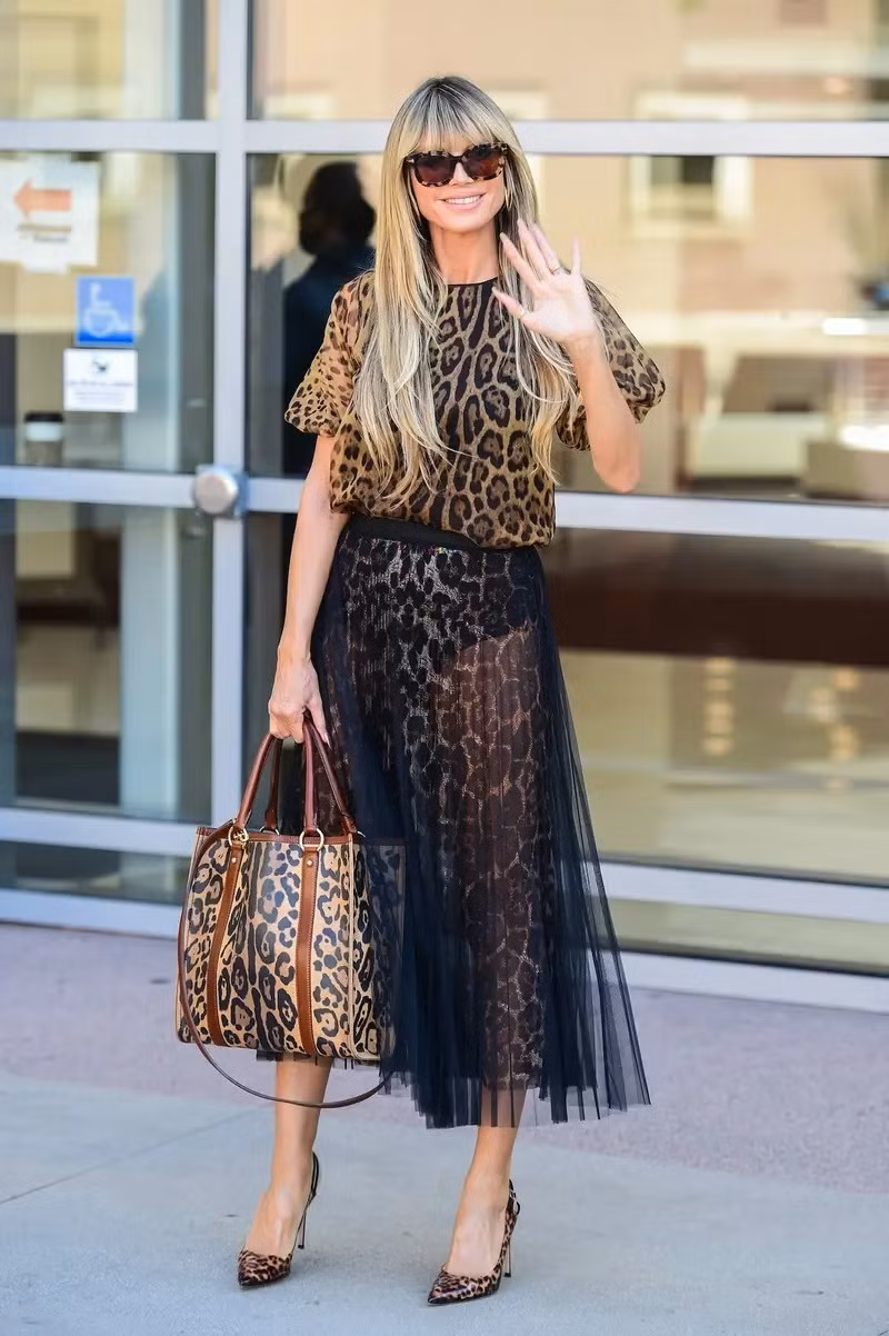 Hình ảnh của Heidi Klum gắn liền với các thiết kế bó sát. Tuy nhiên, cô biết cách thể hiện cá tính riêng khi diện những bộ đồ dáng rộng, phom xòe. Cô chọn trang phục có họa tiết, màu sắc nổi bật và kết hợp một cách khéo léo. Ảnh: People, Page Six.