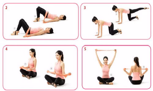 - Bước 2: Tiếp theo, nâng mông cao lên để vai, xương chậu và đầu gối tạo thành một đường thẳng, đồng thời làm căng dải lụa ra. Tư thế cây cầu này cũng được lặp lại 15 lần.