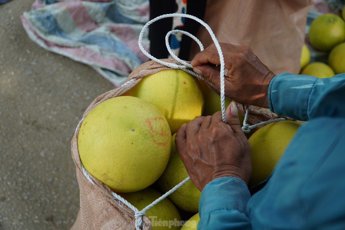 Bưởi được đóng từng bao tải, chở từng xe ra đường để bán và chuyển đi nơi khác tiêu thụ.