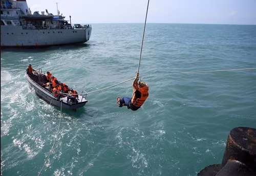 Cán bộ Nhà giàn DK1/10 sử dụng hệ thống ròng rọc và dây thừng để đưa các thành viên đoàn công tác lên nhà giàn.