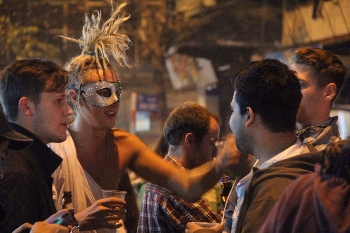 Giao thừa, rất đông người nước ngoài tập trung vui chơi, hóa trang, chụp ảnh trước cửa một khách sạn trên phố Mã Mây.