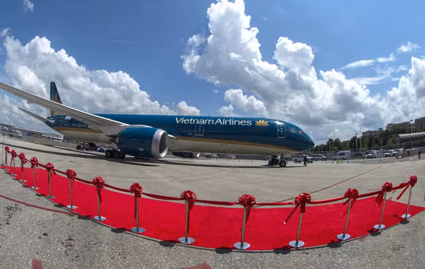 | Máy bay Boeing 787-9 với logo của VNA. |
