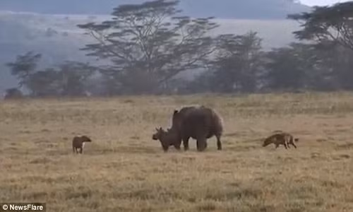 Đoạn video được quay ở Kenya, cho thấy cảnh một con tê giác mẹ vừa chạy, vừa tìm cách che chở cho đứa con nhỏ trước 2 rồi 4 con linh cẩu hung dữ bám theo sau.