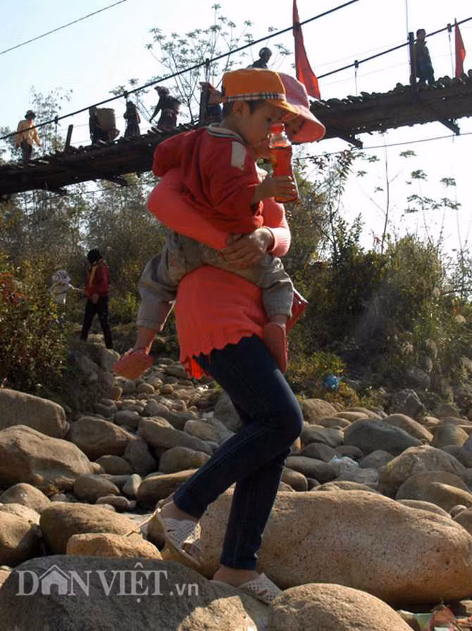 Không ít người đã quyết định lựa chọn giải pháp "an toàn", không đi trên cầu treo nữa mà lội qua dòng suối cạn khô ngay dưới chân cầu treo, đầy đá tảng, đá hộc.