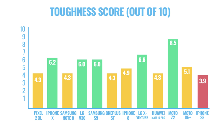 Theo Tom’s Guide, sau mỗi thử nghiệm, mức độ hư hại của điện thoại sẽ được ghi lại và nếu điện thoại không còn dùng được nữa - ví dụ như màn hình vỡ nát - chiếc điện thoại sẽ bị loại khỏi cuộc chơi. Về cách tính điểm, mỗi lần thả rơi điện thoại được tối đa 5 điểm. Với 7 vòng thả rơi, một chiếc điện thoại có thể nhận được tối đa 35 điểm. Nếu điện thoại hỏng ở cú thả rơi 1,8 mét từ cạnh máy, máy bị trừ thêm 10% điểm. Nếu máy hỏng từ độ cao 1,8 mét thả rơi úp mặt, máy bị phạt thêm 5% trong khi đó nếu hỏng từ cú thả rơi vào toilet, điện thoại chỉ bị phạt 2,5% điểm. Điểm số tổng mỗi máy đạt được được chia cho 3,5 để chuyển về tháng 10.