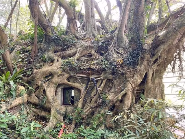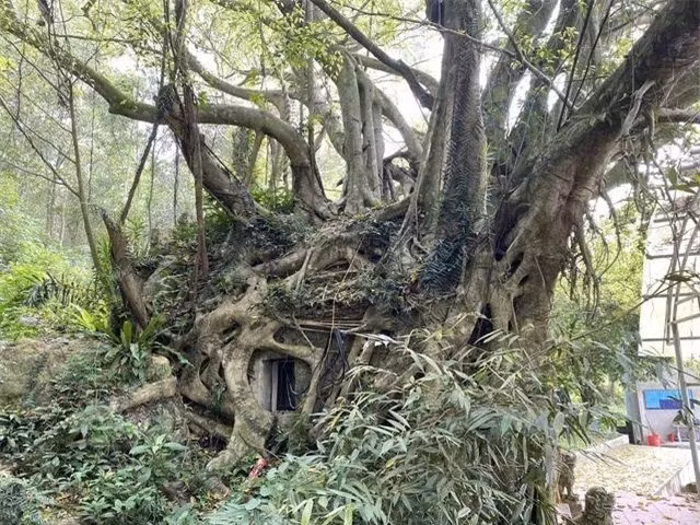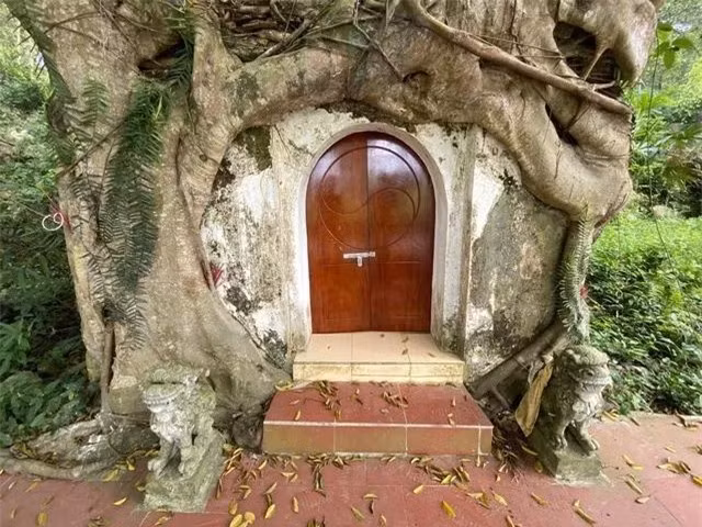 Điều đặc biệt, ngôi chùa được rễ một cây si cổ thụ bao bọc toàn bộ, chỉ để hở cửa vào chùa và 2 cửa sổ.