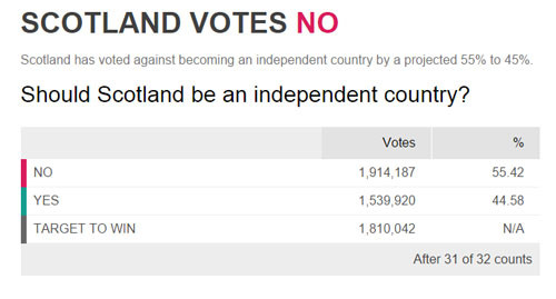 | Kết quả ban đầu ở một số khu vực bỏ phiếu trong cuộc trưng cầu dân ý ở Scotland. |
