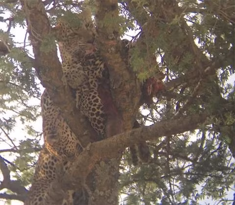 Sau khi đoạt mạng đồng loại, báo hoa lôi lên cây, từ từ xé xác nuốt thịt.