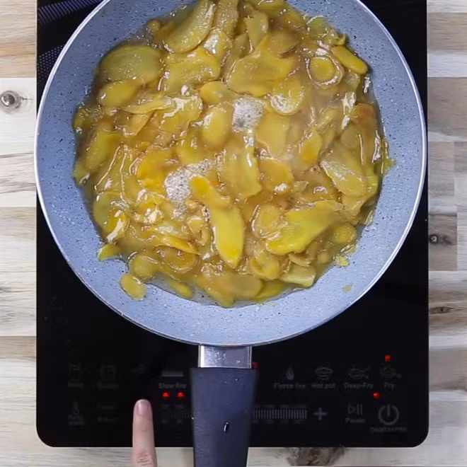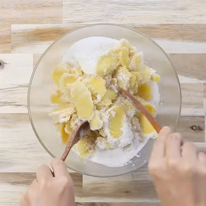 - Ướp đường với gừng trong 2-3 giờ đồng hồ cho tan hết đường.