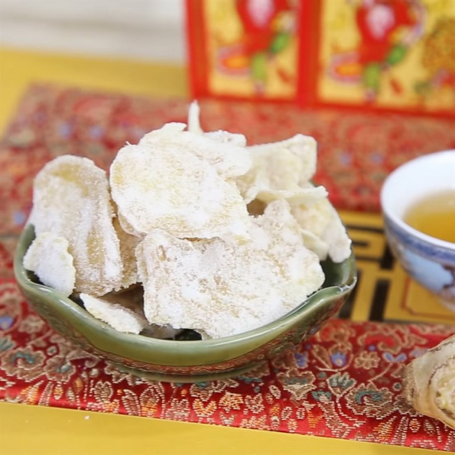 Mứt gừng trông thật bắt mắt với lớp đường màu trắng li ti áo bên ngoài, có hương vị ngọt nhưng không gắt vì làm bằng đường phèn lại cay cay lạ miệng. Đây là món ăn thích hợp để cả gia đình cùng nhâm nhi cũng như đãi khách trong dịp Tết.