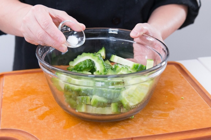 Một cách nữa rất đơn giản đó là sau khi thái nhỏ mướp đắng, bạn dùng một ít muối ướp khoảng 15 phút, tiếp đó rửa sạch với nước lạnh là có thể làm giảm vị đắng.