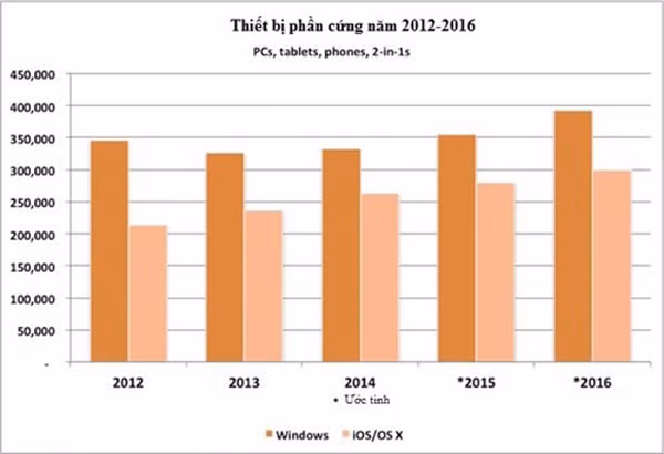 Theo dự báo mới nhất của Gartner, Apple kết thúc năm 2014 với thị phần hệ điều hành tăng 11% nhờ vào việc xuất xưởng được 262,2 triệu thiết bị và thị phần của iOS/OS X sẽ tăng lên 11,3% trong năm 2015 và 11,6% trong năm 2016.
