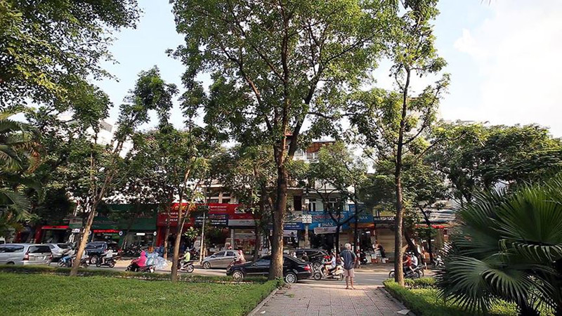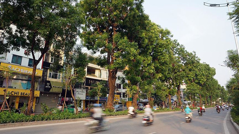 Đường Hoàng Quốc Việt nổi tiếng với dải phân cách rộng được phủ kín cây xanh với nhiều lớp, nhiều tầng tán cây.