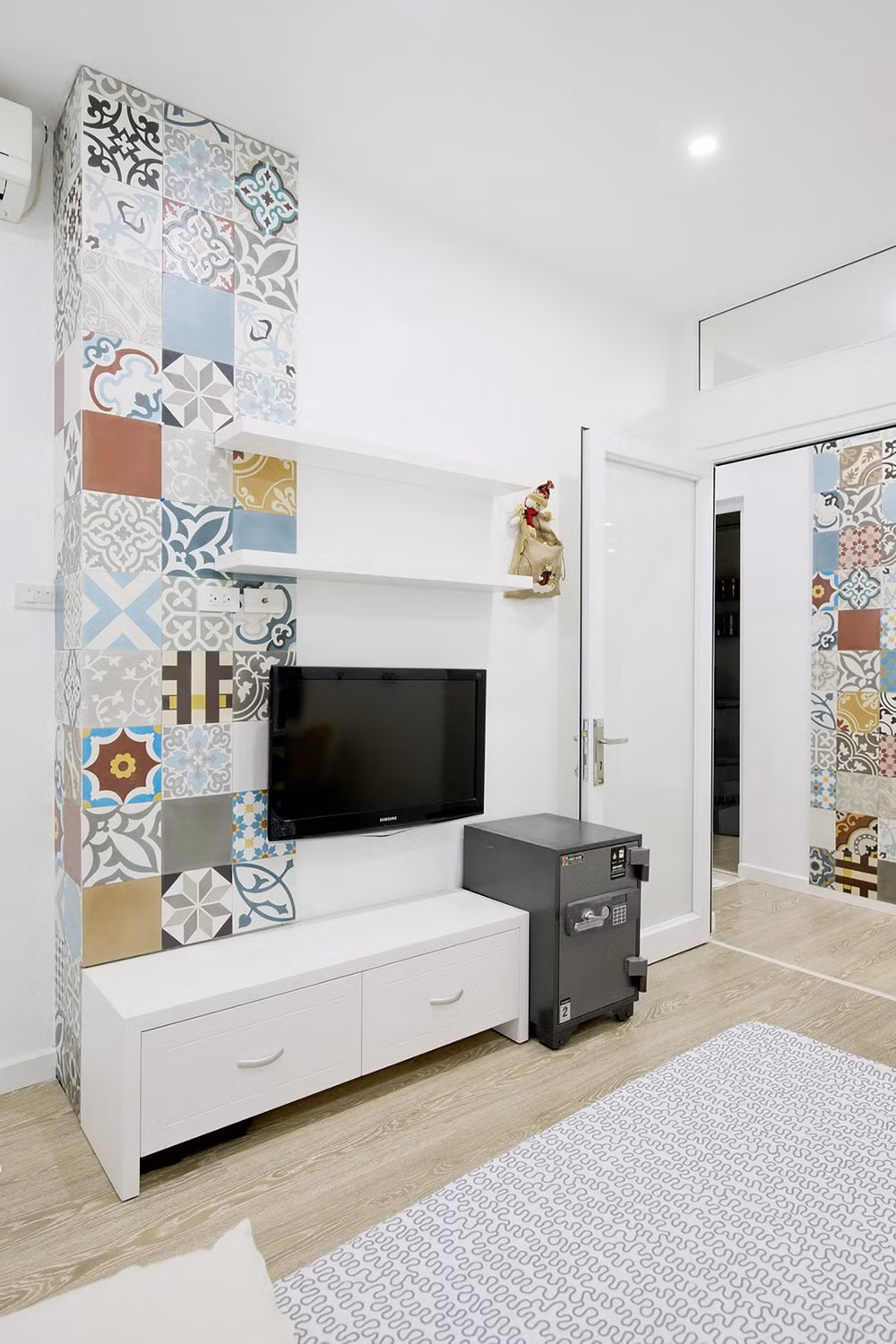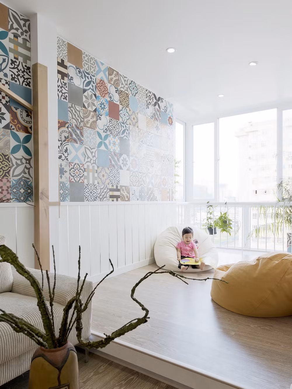 Bức tường lát gạch men nhiều hoa văn góp phần tô điểm cho căn hộ.