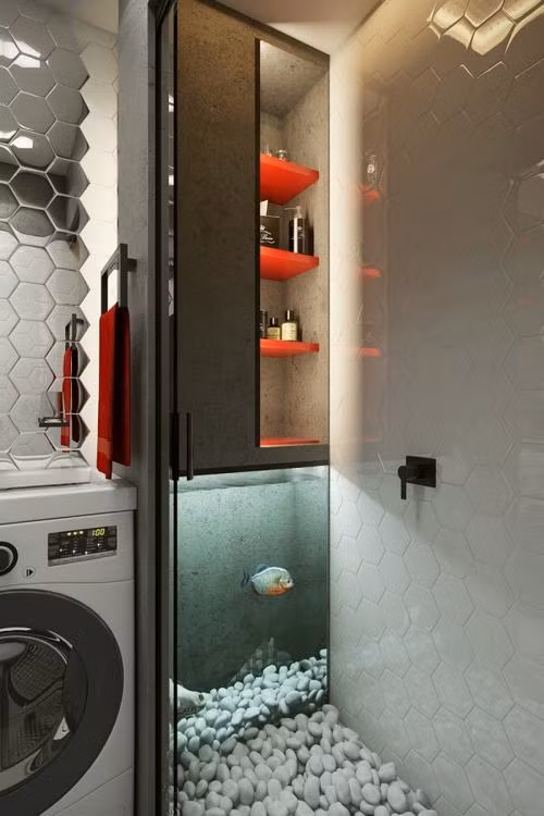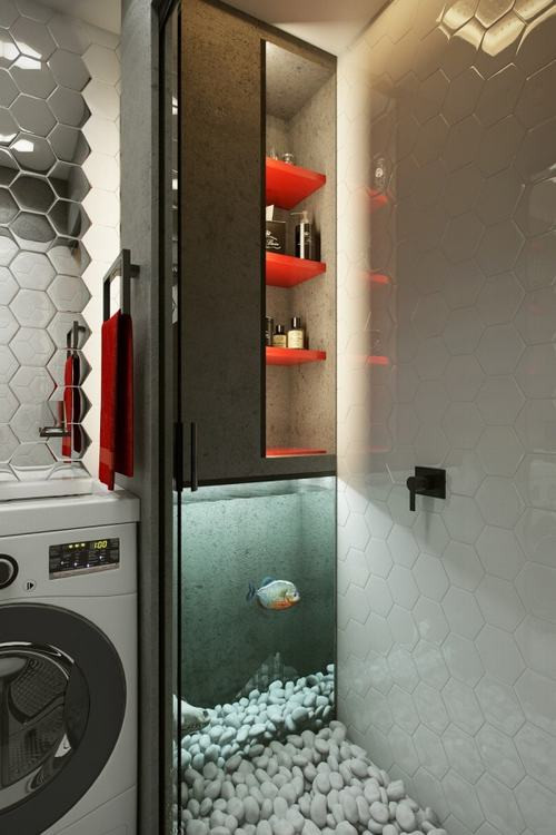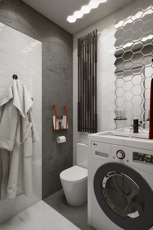 Dù diện tích nhỏ hẹp nhưng phòng tắm vẫn đủ chỗ cho một máy giặt và buồng tắm lát gạch sang trọng.