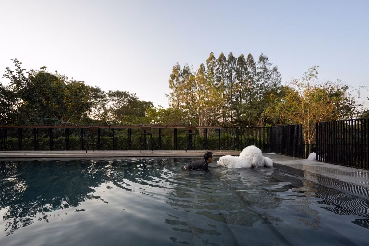 Bậc thang hồ bơi cũng được thiết kế theo tỷ lệ thấp hơn, cho chủ nhà và chó dễ dàng bước lên đúng cách.