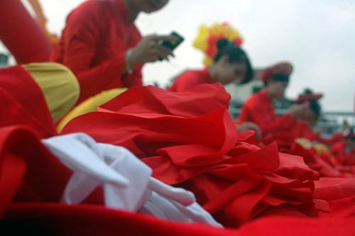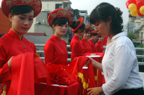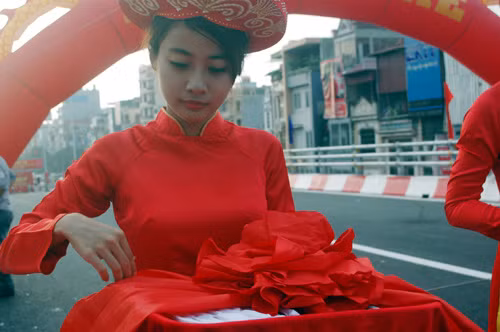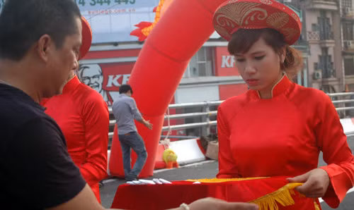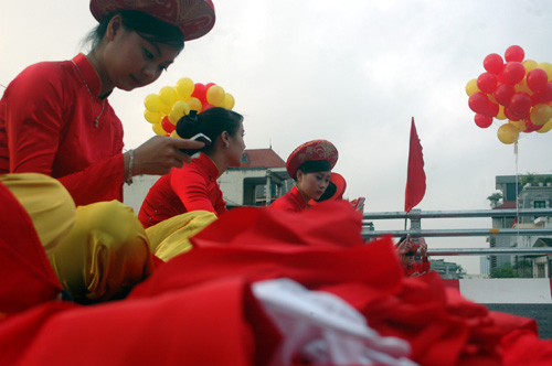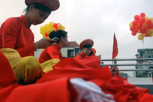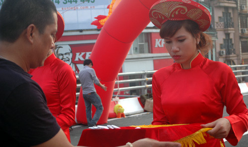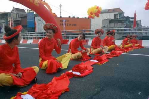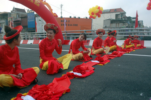 (Kiến Thức) - Chưa đến giờ cắt băng thông xe cầu vượt thép tại ngã tư Đại Cồ Việt - Trần Khát Chân (Hà Nội) sáng nay (30/8), 10 thiếu nữ xinh đẹp trong trang phục áo dài tranh thủ tạo dáng, chụp ảnh...