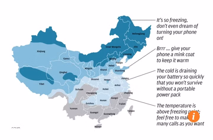 Theo một trang web thời tiết của Trung Quốc, nếu bạn đang sống ở miền bắc, trung tâm hoặc miền đông Trung Quốc trong mùa đông này thì smartphone của bạn dễ gặp các sự cố kỹ thuật hơn bình thường. Thời tiết lạnh giá có thể ảnh hưởng đến hiệu suất hoạt động của điện thoại thông minh.