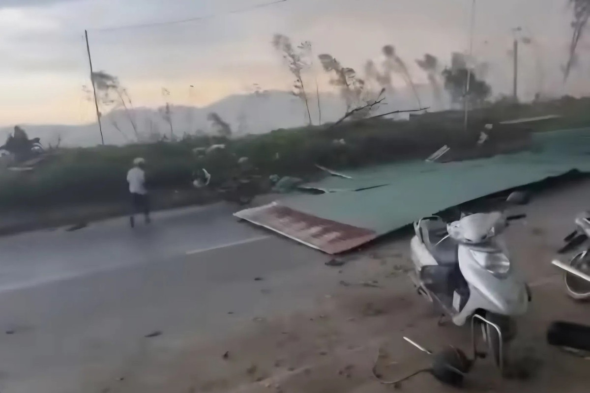 Bất ngờ, mái tôn nhà dân bị lốc cuốn xuống cách người phụ nữ khoảng vài mét. Ma sát từ khung kim loại và mặt đường gây tóe lửa. Người phụ nữ nhanh chóng quay đầu bỏ chạy.