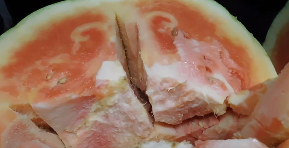 Trái dưa hấu vì còn quá non nên ruột trắng toát chứ chưa thể chín đỏ. Nhìn thành phẩm mà dân mạng ai cũng buồn cười.