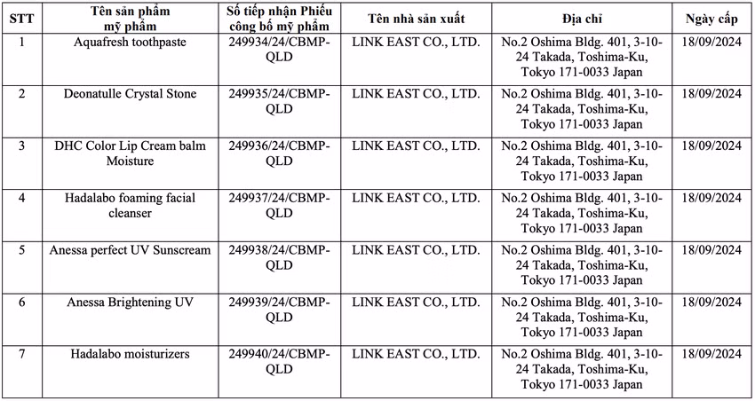 Cụ thể, Cục Quản lý Dược thu hồi 32 số tiếp nhận Phiếu công bố sản phẩm mỹ phẩm do Cục Quản lý Dược cấp đối với sản phẩm mỹ phẩm do Doanh nghiệp chịu trách nhiệm đưa sản phẩm ra thị trường là Công ty TNHH JP-Bùi Đặng (địa chỉ số 54 Khu tập thể In- May 19/5 Bộ công an, đường 19/5, Phường Văn Quán, Quận Hà Đông, TP Hà Nội). Link East Co., Ltd (No.2 Oshima Bldg. 401, 3-10- 24 Takada, Toshima-Ku, Tokyo 171-0033 Japan) là đơn vị sản xuất.