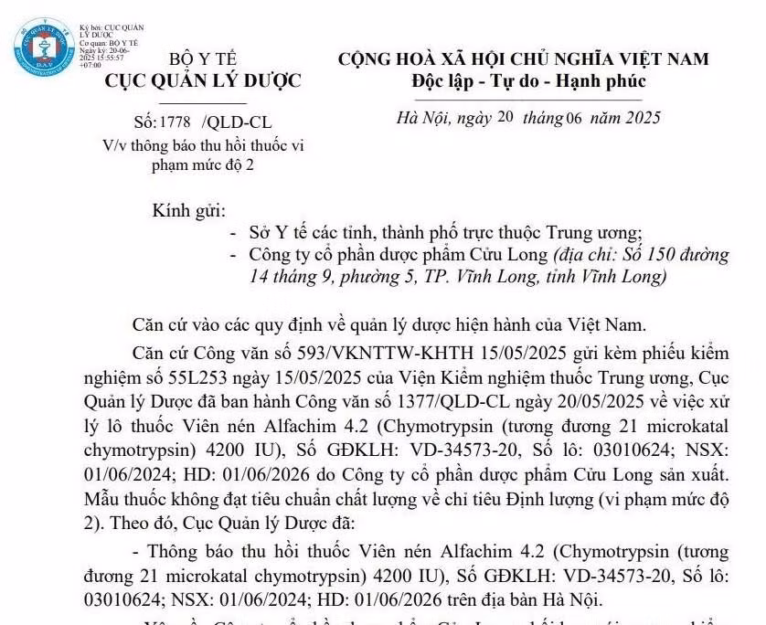 Cục Quản lý Dược yêu cầu Công ty Cổ phần dược phẩm Cửu Long phối hợp với nhà phân phối thuốc, phải gửi thông báo thu hồi tới các cơ sở bán buôn, bán lẻ, sử dụng Viên nén Alfachim 4.2 (Chymotrypsin (tương đương 21 microkatal chymotrypsin) 4200 IU), tiến hành thu hồi toàn bộ lô thuốc không đạt tiêu chuẩn chất lượng nêu trên trong thời hạn 2 ngày kể từ ngày ký Công văn.