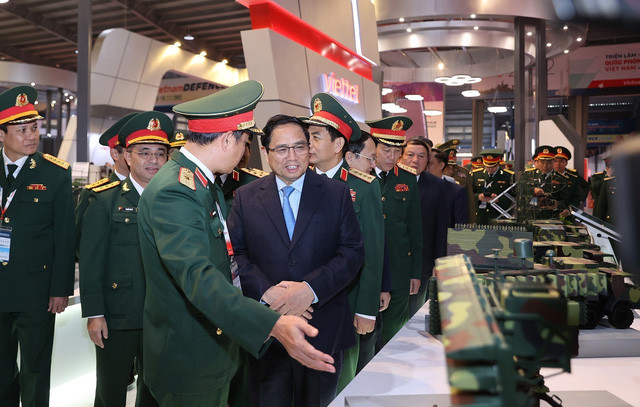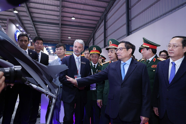 Thủ tướng Phạm Minh Chính tham quan mô hình sản phẩm vũ khí, khí tài tại Triển lãm Quốc phòng quốc tế Việt Nam 2022. Ảnh: Dương Giang - TTXVN