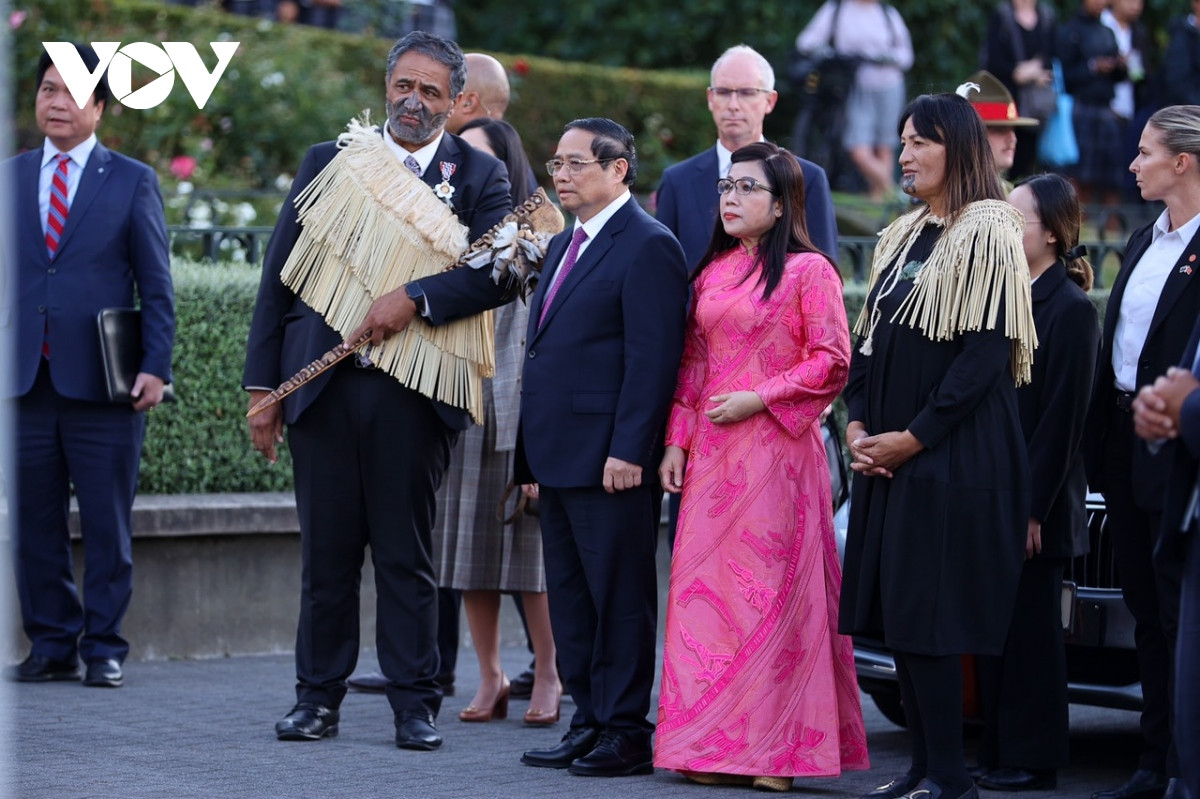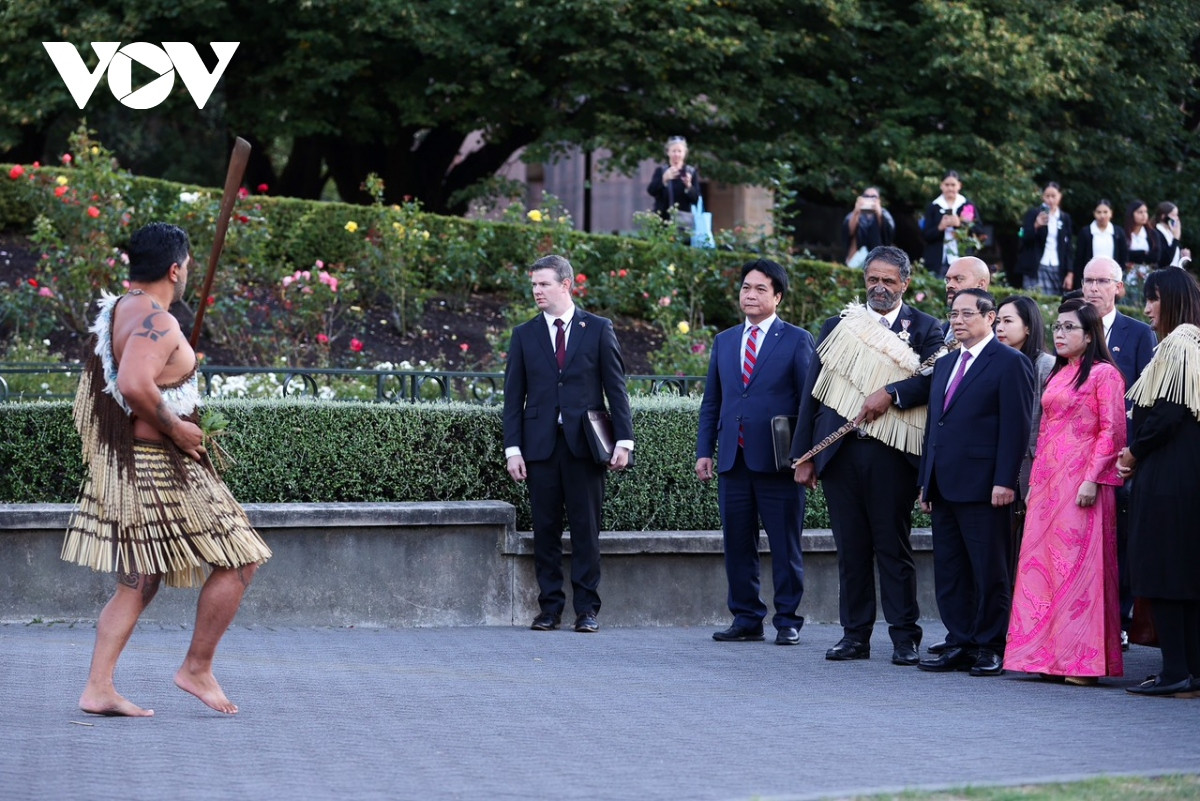 Bước vào lễ đón truyền thống của thổ dân Maori, chiến binh Maori múa vũ khí chào đón khách và "đội trưởng đội lễ tân" Maori đặt một con dao gỗ xuống đất trước Thủ tướng Phạm Minh Chính và phu nhân. Thủ tướng vui vẻ nhặt dao lên và không rời mắt khỏi chiến binh Maori.