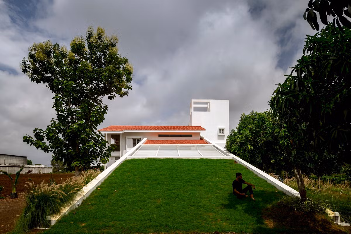 Ngôi nhà được thiết kế đường mái dốc kéo dài đến tận mặt đất và có mặt tiền là bãi cỏ xanh mướt mang lại không gian sống yên bình, tránh xa cuộc sống đô thị ồn ào và vội vã.