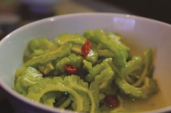 Chế biến: Khổ qua rửa sạch, thái lát, trụng qua nước sôi, vớt ra ngâm trong nước lạnh. Bắc chảo lên bếp, đổ ít dầu, thêm khổ qua đảo đều, gần chín, nêm muối, bột nêm, nước tương, sau cùng dùng bột nêm làm xốt, múc ra đĩa.