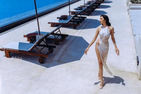 Mỹ nhân 9X diện đầm ôm sát màu vàng, pose dáng cực nghệ giữa hồ bơi.