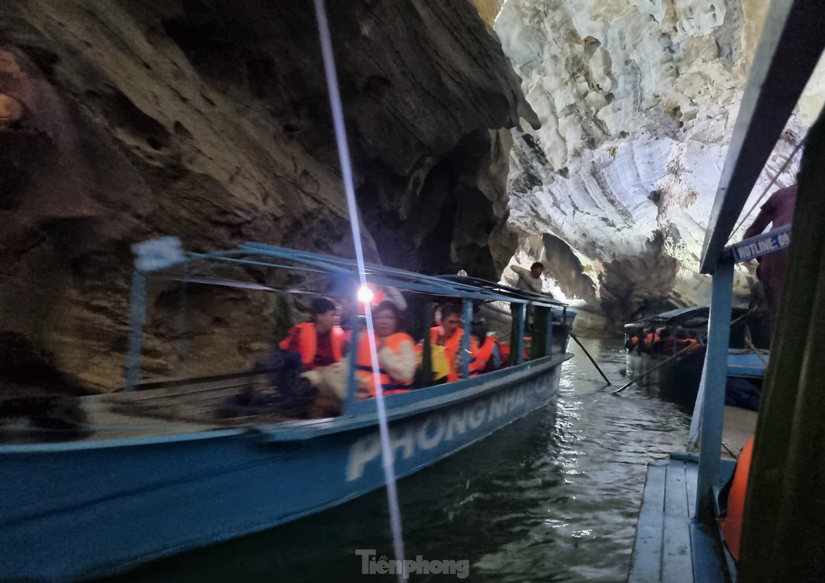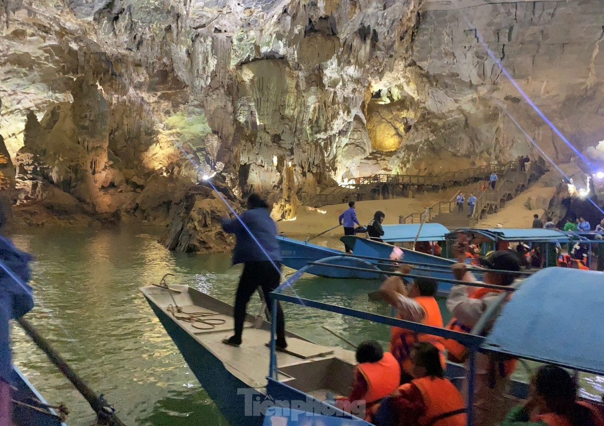 Thuyền chở khách tham quan tấp nập trong động Phong Nha. Động này dài hơn 7.700m, có 14 hang và dòng sông ngầm dài gần 14.000m. Các thạch nhũ trong động trải qua hàng triệu năm kiến tạo từ đá vôi dạng karst, bị nước mưa thẩm thấu, hòa tan và chảy xuống tạo thành những nhũ đá vô cùng lạ mắt như hình sư tử, hình ngai vàng, hình Đức Phật...