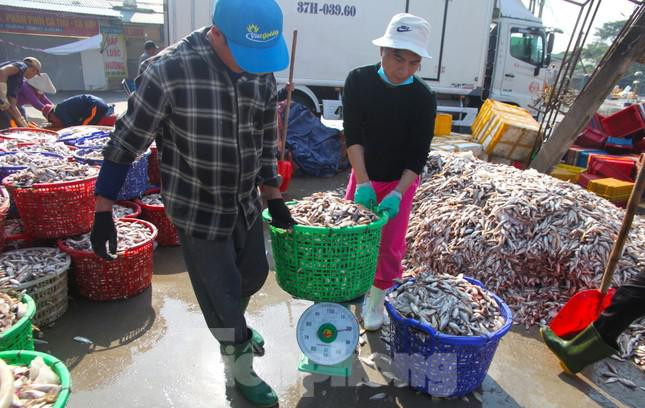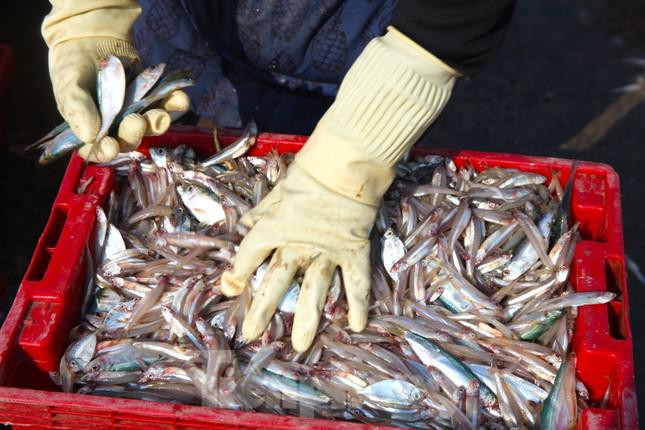 Công việc của đội bốc vác thuê là vận chuyển cá từ tàu vào bờ rồi phân vào từng khay nhựa. Các lao động sau đó sẽ bốc khay nhựa lên những xe tải đông lạnh đã chờ sẵn.