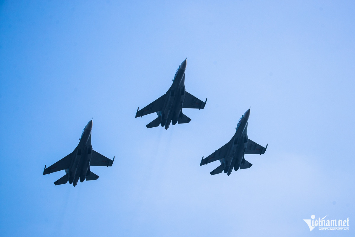 Trong ảnh là biên đội gồm 4 tiêm kích Su-30MK2 luyện tập bay biểu diễn theo đội hình ngang.