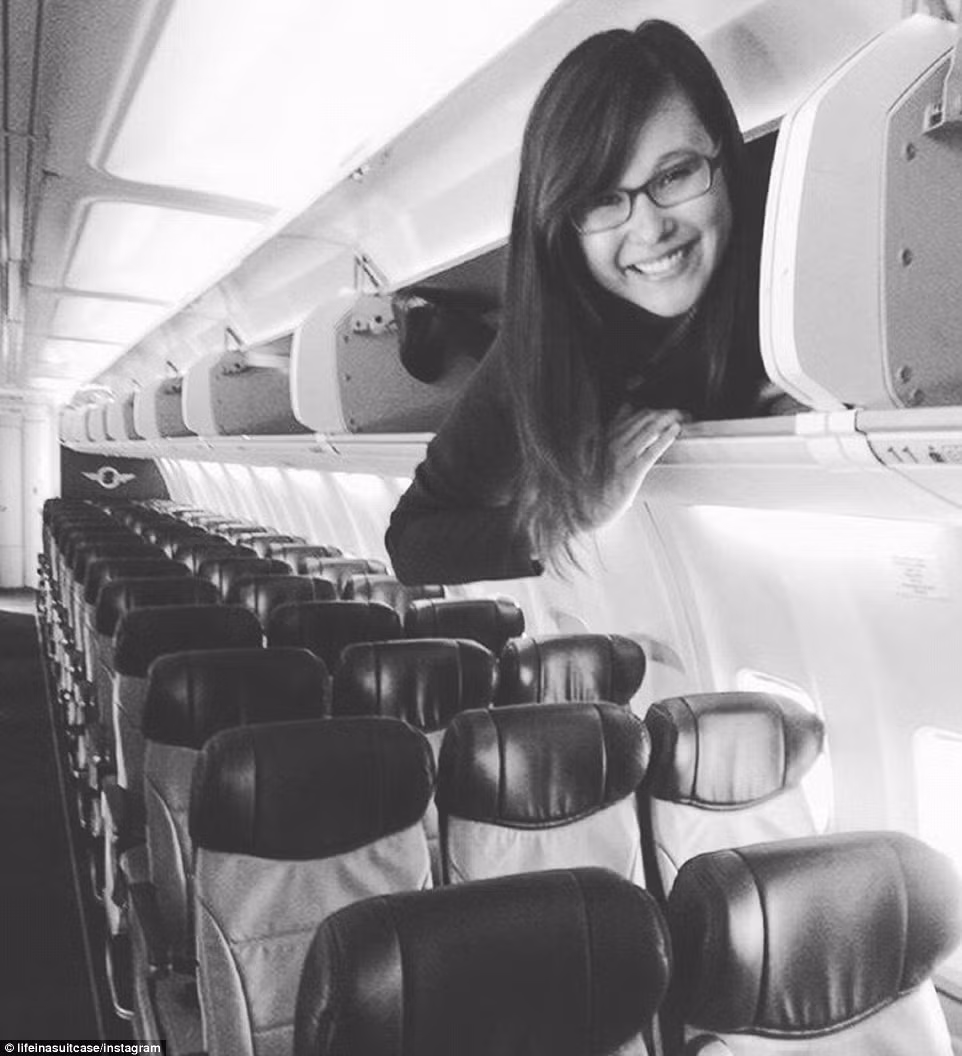Nữ tiếp viên của hãng hàng không Southwest Airlines chụp ảnh khi nằm trong ngăn chứa hành lý trên máy bay.