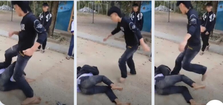 Đáng nói, khi nam sinh gục ngã xuống sân trường nhưng vẫn bị bạn kia tiếp tục đấm đá vào bụng và mặt. Thậm chí, người này còn dùng cả chân đạp vào mặt nam sinh này.