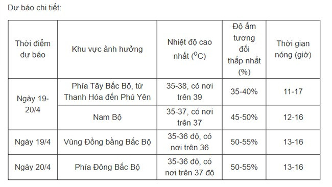Ngày 19/4, vùng đồng bằng Bắc Bộ có nắng nóng, ngày 20/4 nắng nóng mở rộng ra toàn khu vực phía Đông Bắc Bộ với nhiệt độ cao nhất 35-36 độ, có nơi trên 36 độ, độ ẩm tương đối thấp nhất phổ biến từ 50-55%. Nắng nóng ở phía Tây Bắc Bộ, khu vực từ Thanh Hóa đến Phú Yên và Nam Bộ có khả năng kéo dài trong nhiều ngày tới.