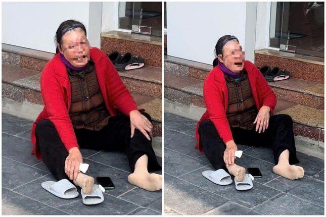 Hình ảnh người phụ nữ với khuôn mặt bị phù nề, liên tục gào khóc trước cơ sở thẩm mỹ viện.