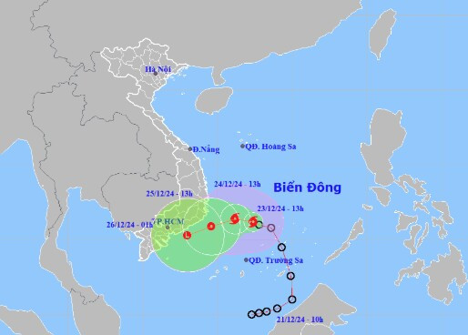 Dự báo 24 giờ tiếp theo, bão đổi hướng Tây Tây Nam, tốc độ khoảng 5-10 km/h và suy yếu dần thành áp thấp nhiệt đới. Đến 13h ngày 25/12, vị trí tâm áp thấp nhiệt đới trên vùng biển từ Phú Yên đến Bà Rịa - Vũng Tàu, cường độ giảm còn cấp 6, giật cấp 8.