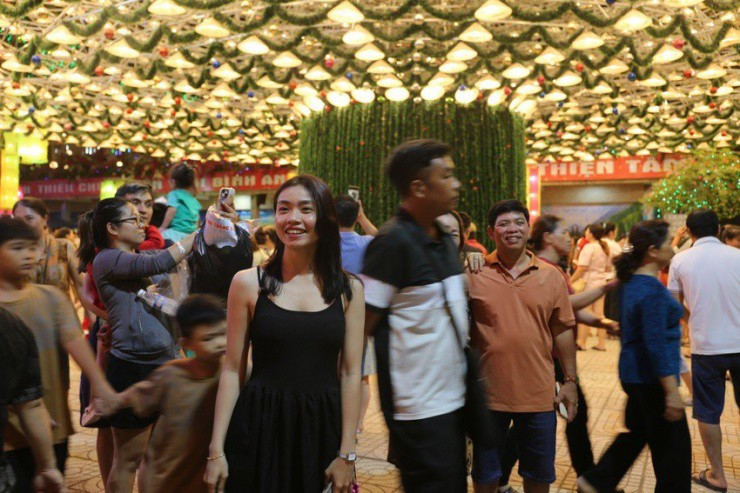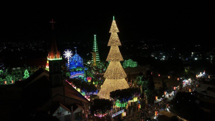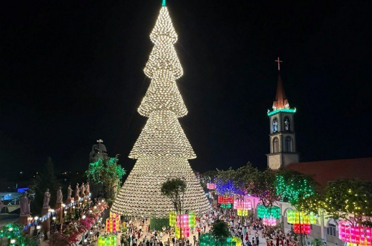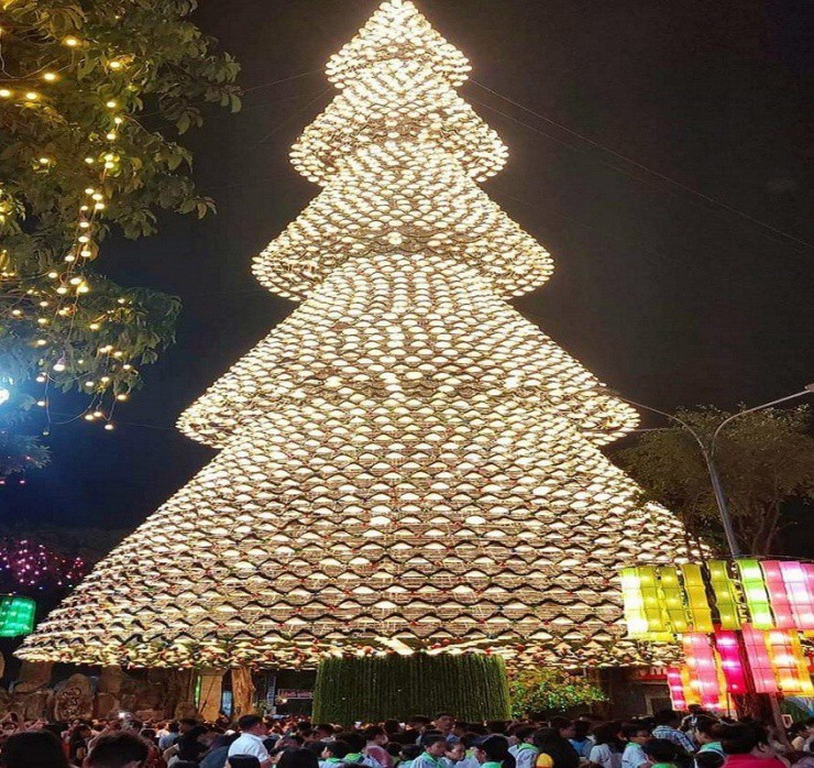 Cây thông Noel tại nhà thờ Hà Phát (TP Biên Hòa, Đồng Nai) được ghép từ hơn 4.200 chiếc nón lá xếp lại thành hàng ngang dọc theo đúng kích cỡ. Mỗi chiếc nón được lắp một bóng đèn tạo thành một tháp ánh sáng lung linh.