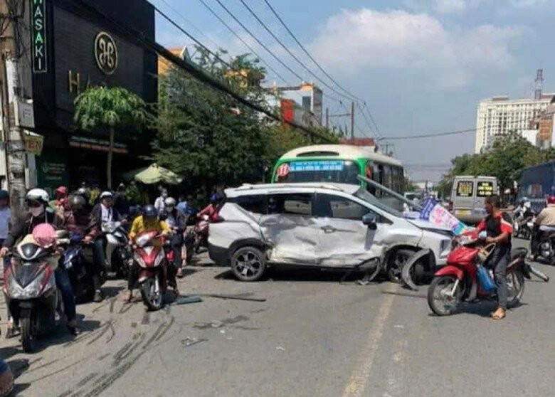 Cú tông mạnh khiến xe 7 chỗ lao qua làn đường ngược chiều va chạm với xe buýt đang đi từ TP Biên Hòa xuống. Lúc này, ôtô 5 chỗ tiếp tục lao thẳng qua bên kia đường, tông mạnh vào cây xanh mới dừng lại.