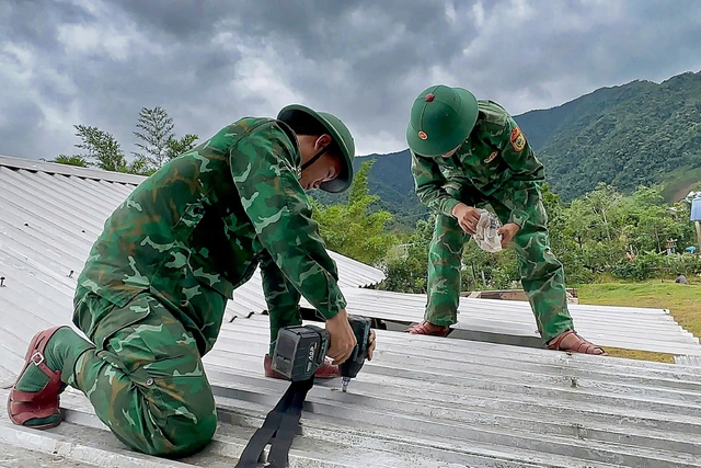 Bộ đội Biên phòng hỗ trợ người dân khắc phục hậu quả. Ảnh: Võ Tiến.