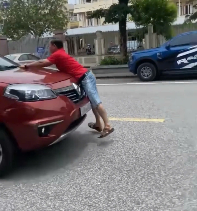 Sau đó, người đàn ông áo đen lên chiếc ô tô biển kiểm soát Hà Nội đang đỗ bên đường để rời đi thì người áo đỏ đứng chặn trước đầu xe. Khi xe di chuyển thì người này bám vào nắp capo chiếc xe.