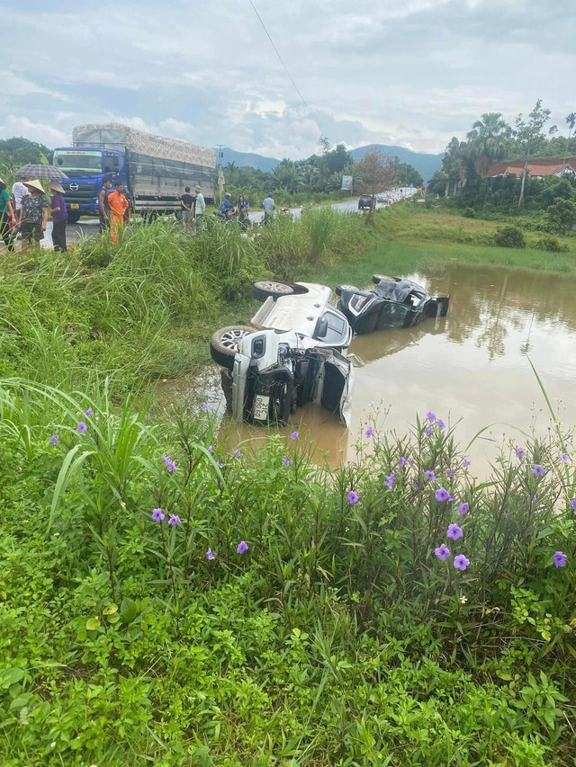 Vụ tai nạn hi hữu xảy ra chiều 13/8 tại đoạn đường thuộc khu 17, xã Tu Vũ, huyện Thanh Thủy, tỉnh Phú Thọ. Xe bán tải mang BKS của tỉnh Yên Bái va chạm với ô tô 7 chỗ, rồi cả hai xe đều lao xuống ao.
