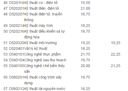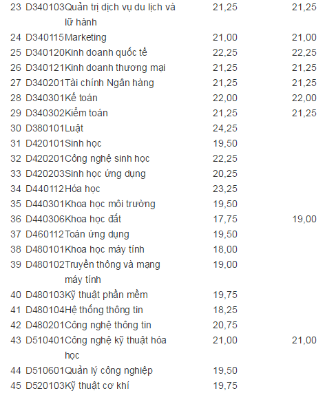 Bảng điểm trúng tuyển nguyện vọng 1 năm 2015 của Đại học Cần Thơ: