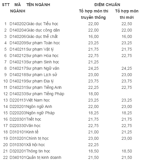 - Có tổng số điểm 3 môn thi của tổ hợp xét tuyển cộng với tổng số điểm ưu tiên khu vực và đối tượng từ bằng hoặc lớn hơn điểm chuẩn. Đối với ngành Giáo dục thể chất, ngoài các điều kiện nêu còn phải thỏa điều kiện sau: Nam có chiều cao 1,65m, cân nặng 45 kg trở lên; nữ có chiều cao 1,55m, cân nặng 40 kg trở lên; Điểm thi môn Năng khiếu: phải đạt từ 5 điểm trở lên.