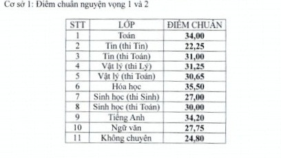 Điểm chuẩn vào các lớp chuyên thuộc trường THPT chuyên Quốc học Huế khá đồng đều, cao nhất là lớp chuyên Sinh 34,25 điểm, thấp nhất là chuyên Sử 26,4 điểm.