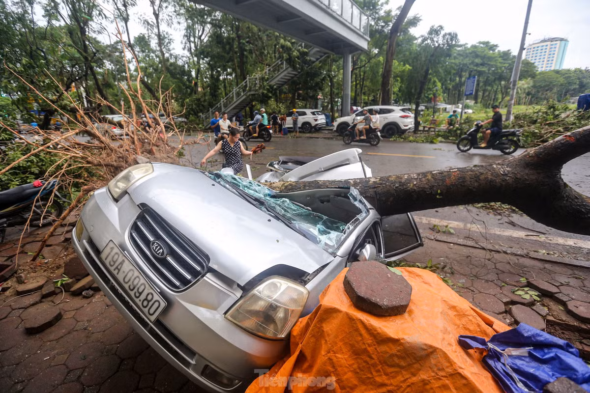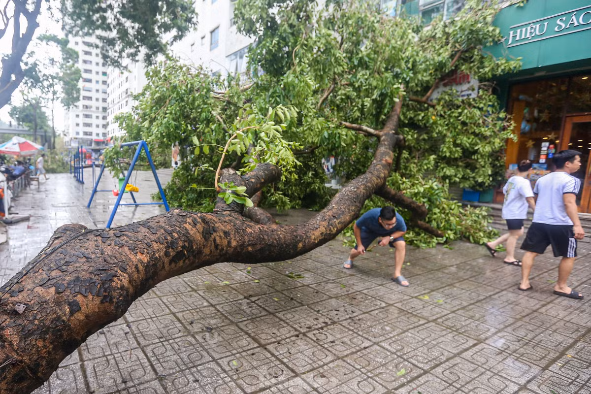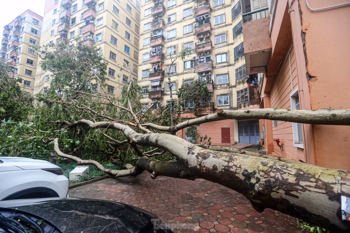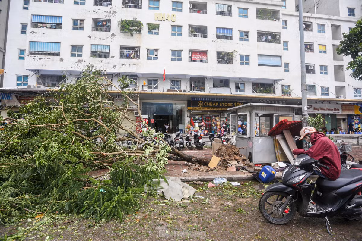 Cả tòa nhà chung cư mấy trăm hộ dân bị cô lập vì cây đổ bịt hết lối đi. "Thấy mưa tạnh, sáng xuống đi chợ nhưng không có lối để đi ra, nhiều người bên ngoài có nhà mà không có đường vào. Lúc sau phải huy động nhiều người đến dọn dẹp, cắt bớt cành cây thì mới có lối đi vào nhưng vẫn phải băng qua các cây đổ. Đến hiện tại vẫn không có đường ra cho xe máy", một người dân tại khu đô thị Linh Đàm chia sẻ.